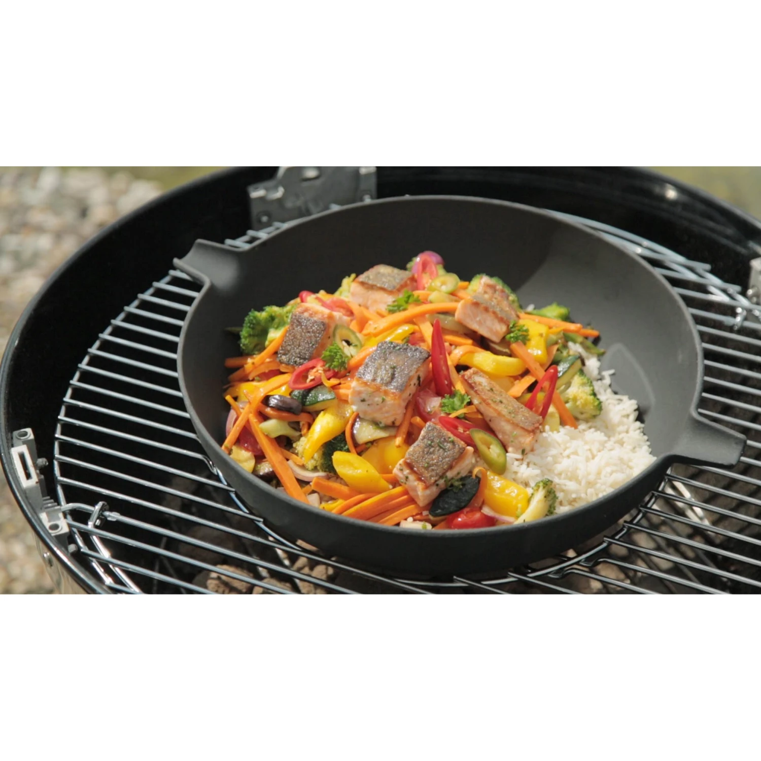 Der Wok-Einleger von tepro wird zusammen mit dem Rost-in-Rost-System mit 57 cm Durchmesser verwendet. Da er aus Gusseisen gefertigt ist, eignet er sich besonders gut zum scharfen Anbraten allerlei Speisen. Der hohe Seitenrand ist vor allem beim Zubereiten von Gemüse-Gerichten und asiatischen Speisen besonders praktisch. Mit seinen 35,3 cm Durchmesser bietet der Einleger dabei genug Platz für verschiedene Leckereien.
